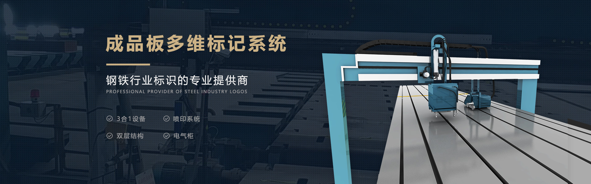 該標(biāo)識(shí)機(jī)采用3合1設(shè)備,即在線面噴、在線側(cè)噴和在線鋼印。采用龍門(mén)機(jī)構(gòu)兩面安裝方式,側(cè)噴在鋼板靠邊對(duì)齊側(cè),臺(tái)式安裝。 輥道運(yùn)動(dòng)方向前端安裝鋼印設(shè)備,后端安裝面噴設(shè)備。鋼
